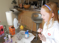 After that trip I really didn't want to go ANYWHERE for a while. Michelle was more than happy to play at home. She wanted to have a "science day" and do experiments. I had the idea to use her play doctor's coat as a white lab coat so she could pretend to be a scientist. She LOVED it. She felt like a real scientist and had a ball playing with mixing chemicals in her little test tubes. It was fun watching her reactions to chemical reactions.