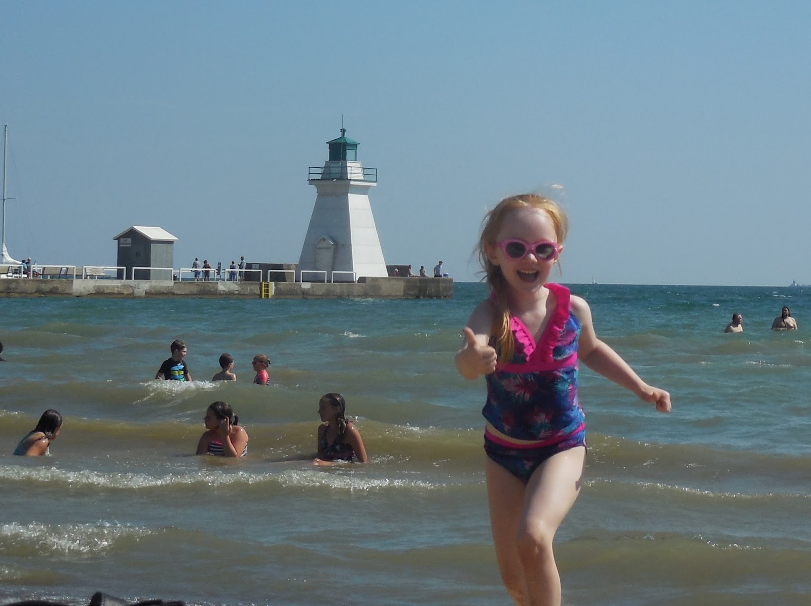 A shot with the lighthouse in the background and I love her smile here as she runs on the beach. It looks like she's even giving a thumbs up. The water looks pretty dirty. Some days it looks turquoise and other days it's pretty brown and murky. Michelle never presses the issue about swimming. She doesn't like dirty water or seaweed either and she's content to mostly play on the sand.